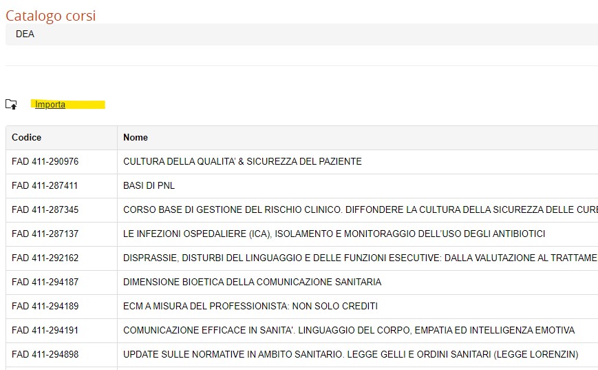 elenco dei corsi già nel catalogo, clicco su Importa