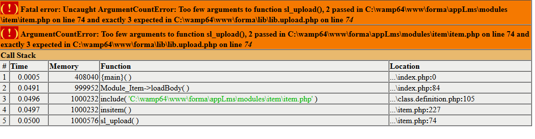 ( ! ) ArgumentCountError: Too few arguments to function sl_upload(), 2 passed in C:\wamp64\www\forma\appLms\modules\item\item.php on line 74 and exactly 3 expected in C:\wamp64\www\forma\lib\lib.upload.php on line 74