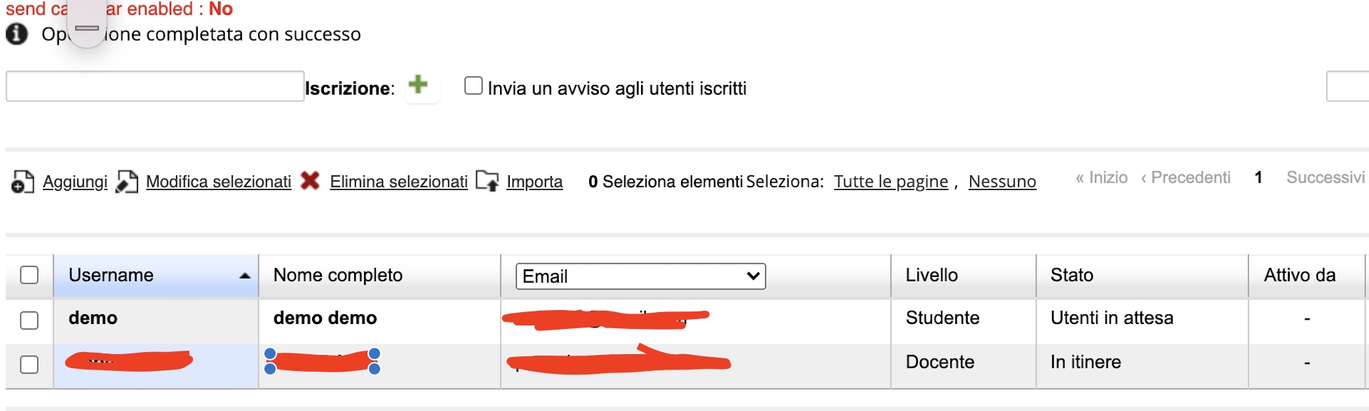 Cosa curiosa: se entro lato amministratore, vado nel corso e provo a iscrivere l'utente, che gia si è iscritto, me lo fa inserire fra gli iscritti e come stato mi da "Utenti in attesa"