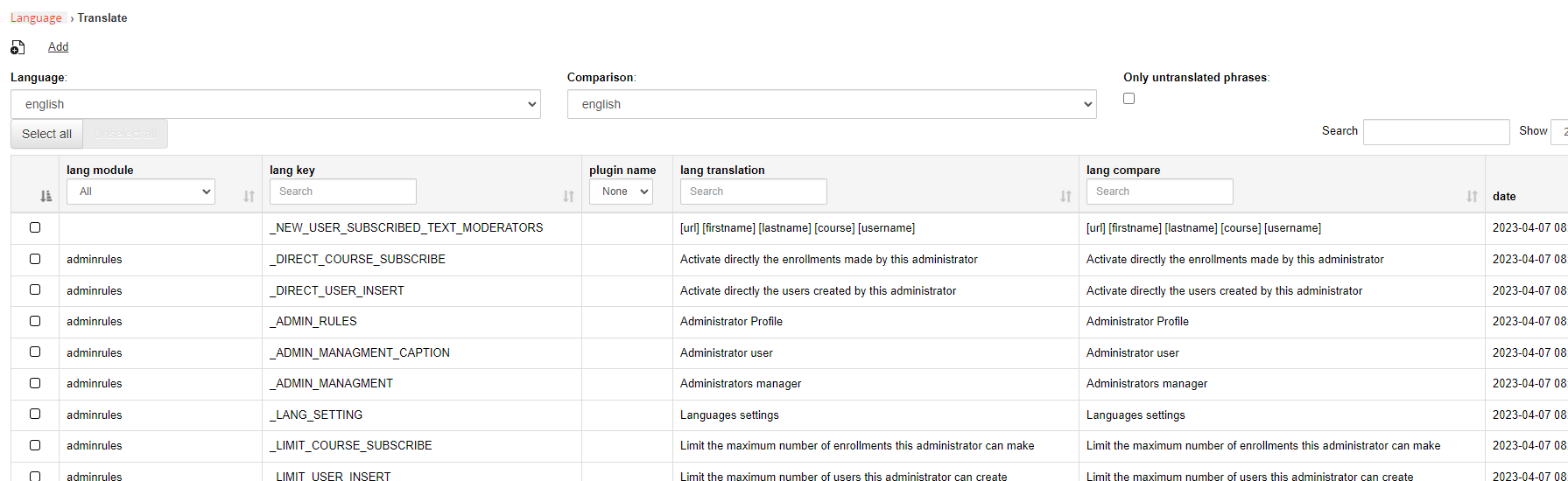 Regarding languages, you have to go to Administration management and search for language keys: https://docs.formalms.org/reference-gui ... uages.html